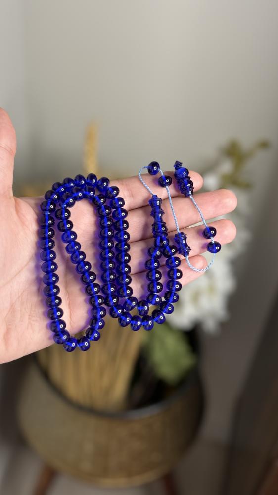 مسباح فاتوران أزرق شفاف بتصميم أنيق على قصة ذروية تعكس جمال الخامة ولمعتها الفاخرة. لونه الأزرق الصافي ولمعانه المميز قطعة فريدة تكمّل إطلالتك .